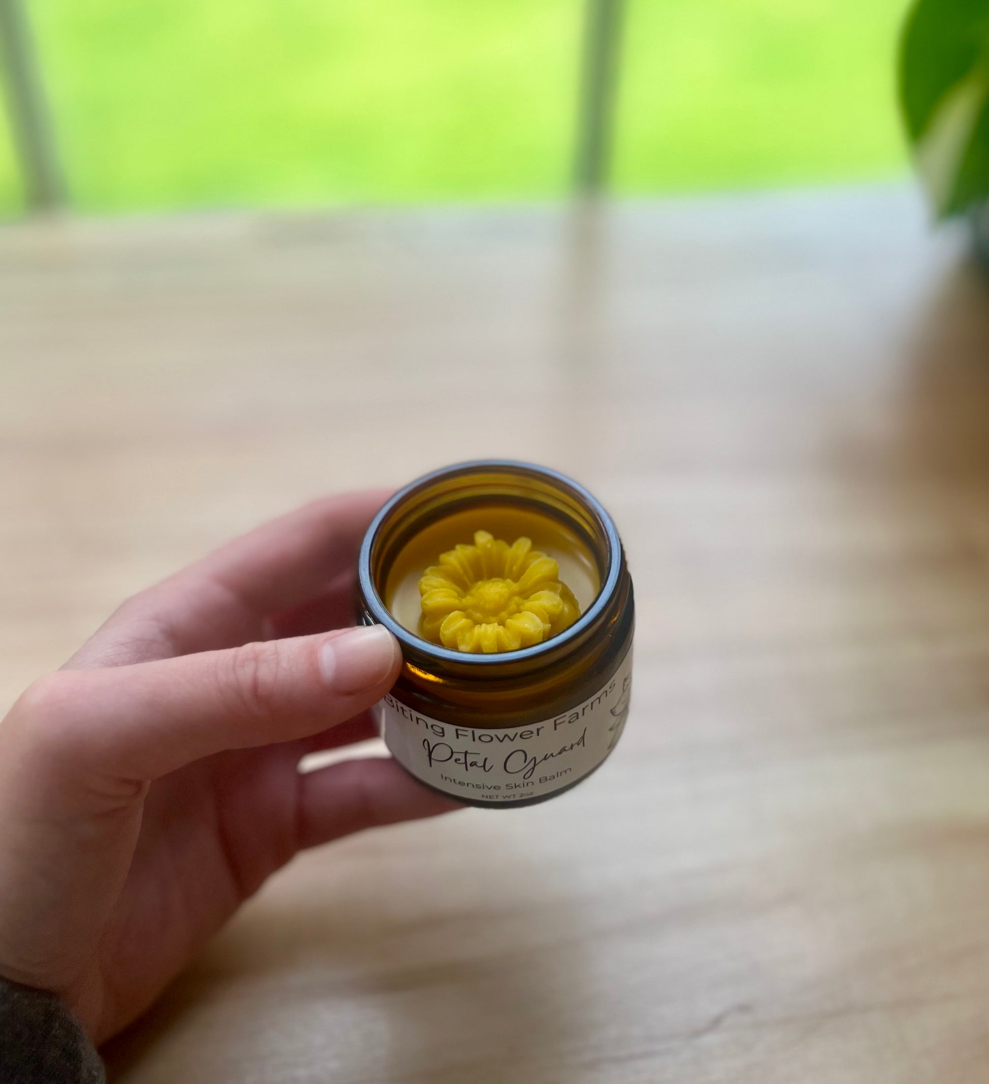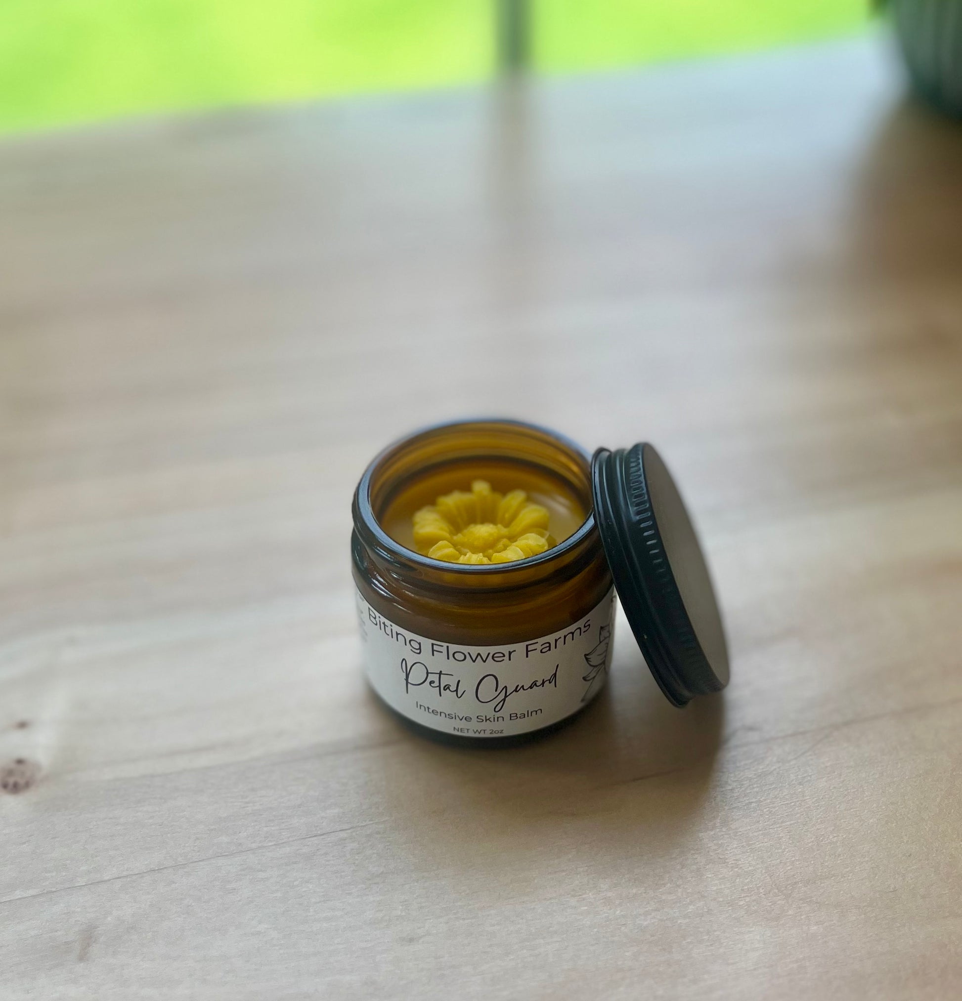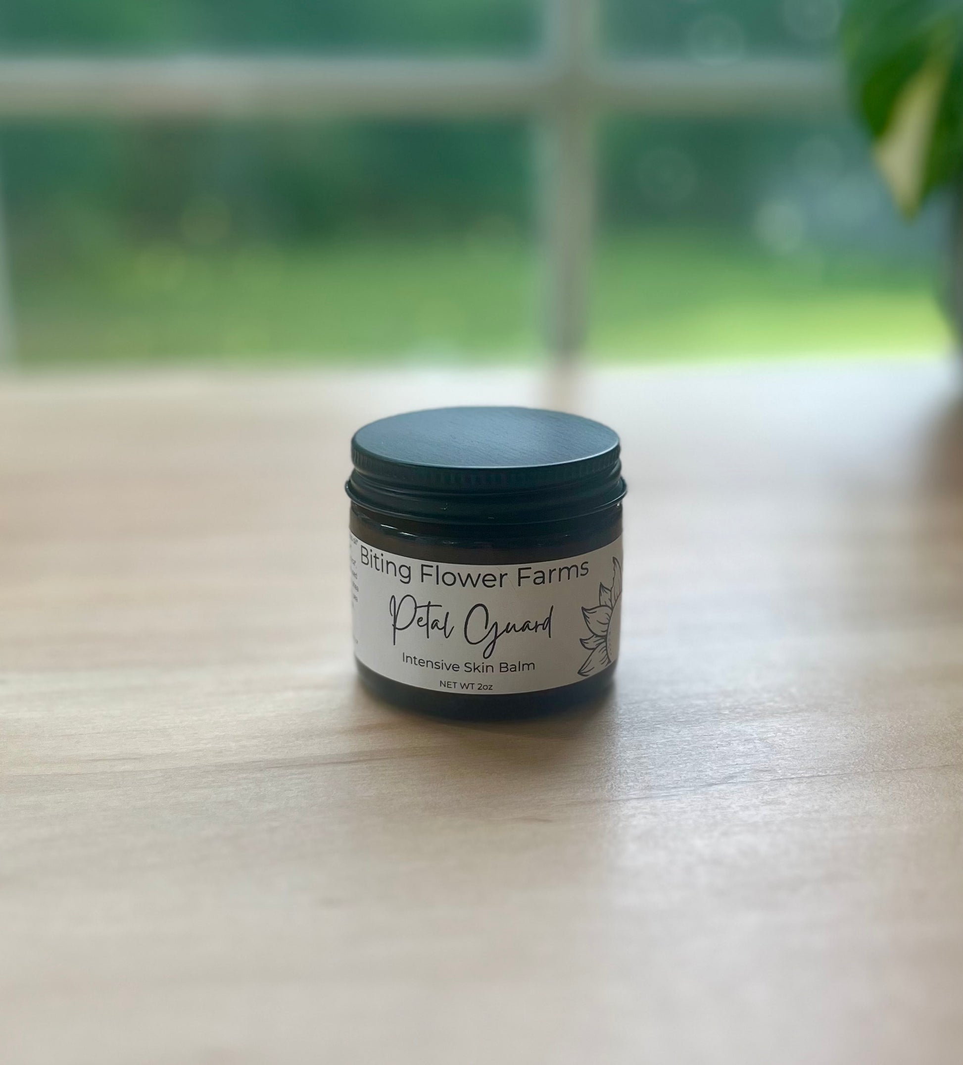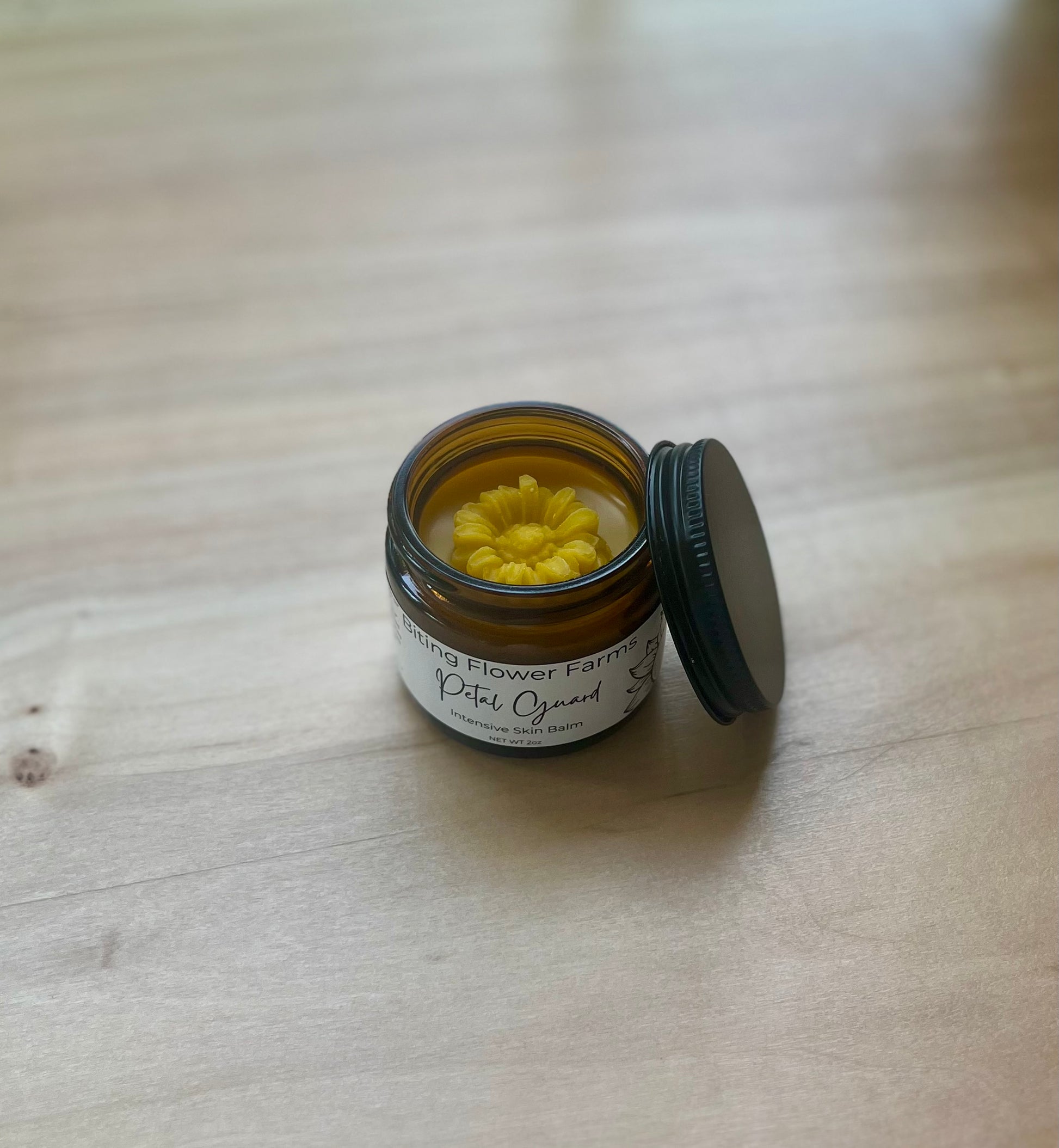 Petal Guard is our new super healing skin treatment, it's a beautiful blend of infused oils such as Organic Avocado Oil infused with Chamomile, Calendula Arnica, Comfrey and Plantain leaf. Organic Jojoba Oil infused with real organic Vanilla beans for a light scent and skin soothing benefits. Shea butter and Kukum Butter are added for extra hydration. Beeswax to solidify the product and add skin protecting benefits. Sea Buckthorn for extra antioxidant powers. Vitamin E oil for even more hydration! All topped off with lavender essential oil for an added skin healing boost and light scent.